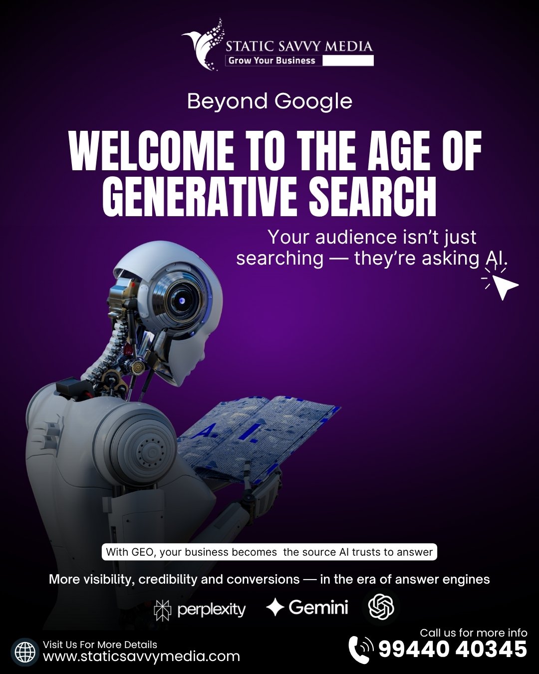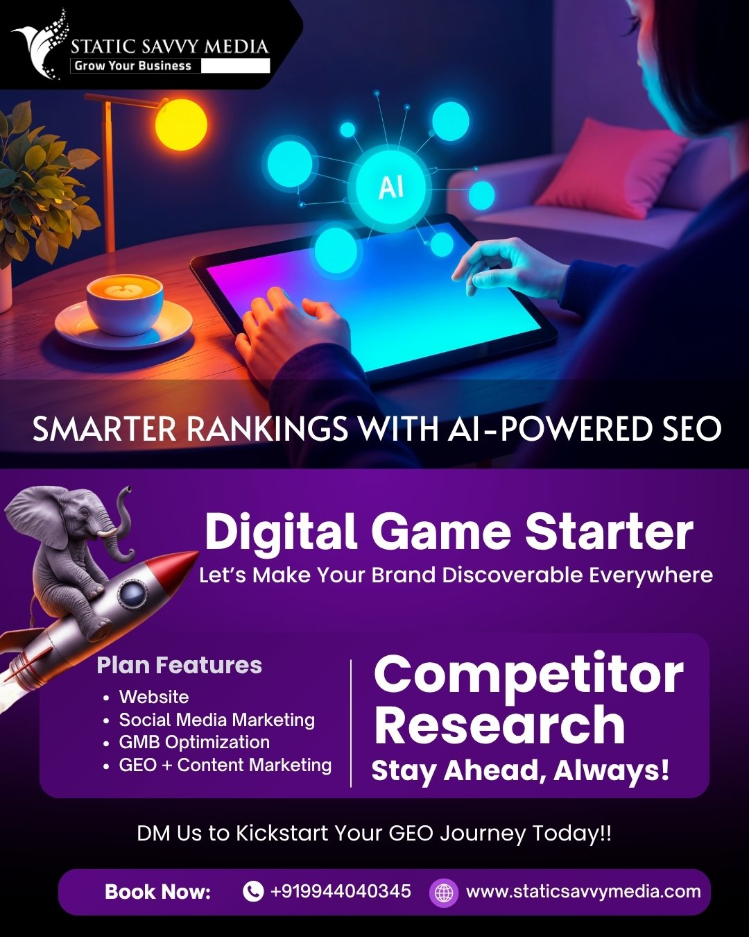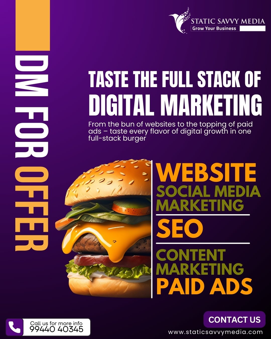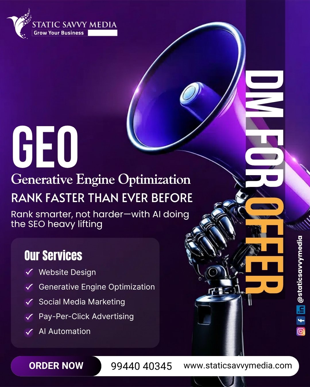 Static Savvy Media is Madurai's leading full-service digital marketing agency specializing in Logo Design, Website Design, Social Media Marketing, SEO, Local SEO, GEO Optimization, GMB Optimization, Branding, CRM Solutions, Landing Pages, Sales Funnels, Google Ads, Performance Marketing, E-commerce Website Development, Content Marketing, Marketing Automation, WhatsApp Marketing, Web Application Development, AI Training, and Digital Marketing Training. We serve all business owners in Madurai and across Tamil Nadu. Whether you're a startup, SMB, or established business, we craft data-driven digital marketing strategies that drive measurable results. Contact us today for your free digital marketing audit!